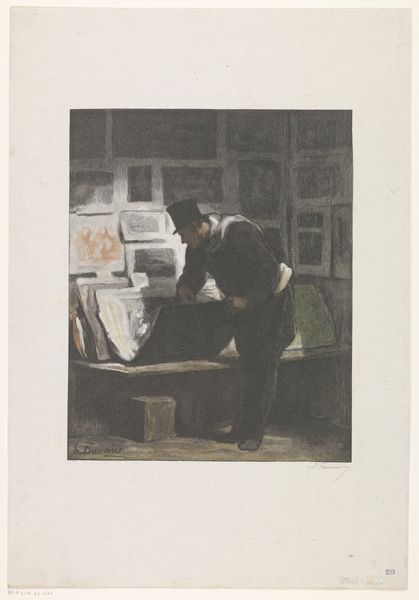 Arthur Puls created this etching, Man Looking Through the Window of an Exchange Office. Notice the man's posture: head bowed, gaze fixed downwards. This is the ancient gesture of melancholia, seen in depictions of Saturn or allegorical figures of sorrow. Consider Dürer's "Melancholia I," where the winged figure sits similarly, surrounded by tools unused, lost in thought. Here, the setting shifts to a modern exchange office, a place of financial transaction. The papers scattered before him suggest not just commerce, but perhaps also confusion, or the weight of economic worry. This posture isn't merely physical; it's a mirror reflecting inner turmoil. The act of looking down, of being weighed down, persists through ages, connecting Dürer’s allegorical figure to this anonymous man at the exchange office. It becomes a timeless symbol of introspection and human vulnerability, echoing in our collective memory.