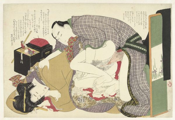 Kitagawa Utamaro made this woodblock print, "Lovers in front of a mirror," during the Edo period in Japan. The print is an example of "shunga," or erotic art, which was a popular genre despite official disapproval. Here, we see a couple engaged in an intimate act, with the man applying makeup to the woman's lips as she gazes into a mirror. Shunga prints circulated widely and were enjoyed by people of all social classes. They often depicted idealized scenes of pleasure and were associated with fertility and good fortune. However, it's important to remember that the production and consumption of these images were shaped by social and cultural norms. For example, the depiction of gender roles and expectations might not align with contemporary values. As historians, we can consult a variety of sources to better understand the historical context of shunga prints, including contemporary literature, social commentaries, and government records. By doing so, we gain a deeper understanding of the complex relationship between art, sexuality, and society in Edo-period Japan.