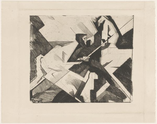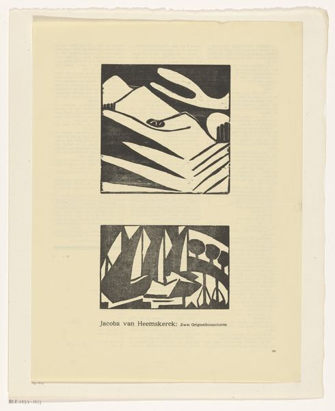 Thijs Rinsema created this linocut print, titled 'Twee ruiters', meaning 'Two Riders' in Dutch. The stark contrast between black and white immediately captures your attention, creating a dynamic interplay of shapes. The composition is a puzzle of geometric forms. Despite the title, the 'riders' are not explicitly depicted. Instead, Rinsema offers a Cubist-inspired interpretation through abstracted lines and planes. The semi-circular shapes might suggest the curves of horses or riders, but the overall effect is one of fragmentation and reassembly. This was a period where artists were questioning traditional representation. Rinsema uses the linocut medium to create bold, graphic marks. The texture of the linoleum adds another layer of visual interest. The design seems to challenge our perception, inviting us to piece together our own interpretation of the subject. Rinsema's work encourages us to move beyond traditional modes of seeing and to embrace new ways of understanding the world through abstraction.