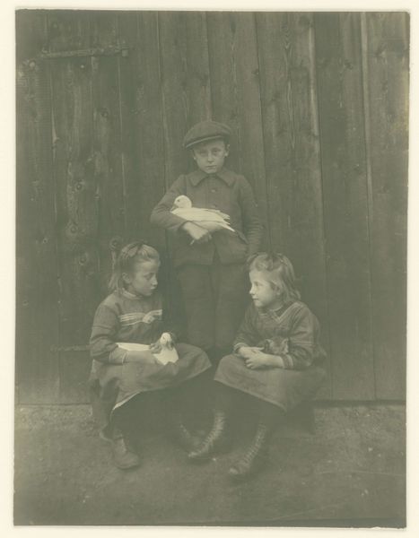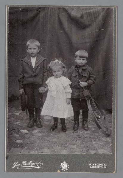 Curator: This photograph, taken after 1903 by Willem Carel van der Kop, captures three young children in a garden, likely the artist's own: the twins Ad and Johanna, and Han. They're playing with a ribbon. It's housed at the Rijksmuseum. Editor: There's a haunting, melancholic mood immediately evident, wouldn't you say? The muted tones contribute to this, as does the slightly stiff arrangement of the children. It almost feels staged, carefully constructed. Curator: It does speak to the formality of portraiture at the time, yes. However, I am more struck by how this image captures childhood and the importance of play. Ribbon games, for instance, were laden with symbolism. The ribbon could represent connection, fate, or even the umbilical cord. Editor: I can see that symbolic potential. What about the visual space, though? The depth of field is shallow. Notice how the foliage in the background blurs almost entirely. Our eyes are focused on the tonal modulations on the plane where children are, nothing distracts the gaze. Curator: Precisely! Consider how those backgrounds frame the subjects: they provide an Edenic or liminal backdrop, invoking innocence, and the dawn of adulthood. Editor: And what of their clothing? Notice the textural details—the woven ribbon against the flat, smooth fabric of the coats and sailor’s attire. Van der Kop plays with tactile contrast. It all draws the eye, makes you want to reach out and touch the surfaces. Curator: It's quite striking, how clothing signifies class here but, on a symbolic level, their clothing implies belonging. Those sartorial signals underscore their place in Dutch society at the time, hinting at continuity and cultural legacy. Editor: Seeing these visual cues layered together lets one sense what those bygone photographic practices stood for in representing identity. This all makes this piece quite captivating to analyze from different angles. Curator: Yes, indeed! I find it quite evocative how it touches on both personal intimacy and wider social frameworks.