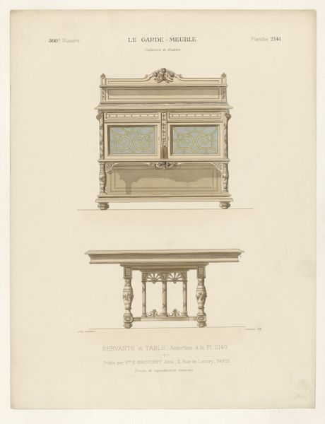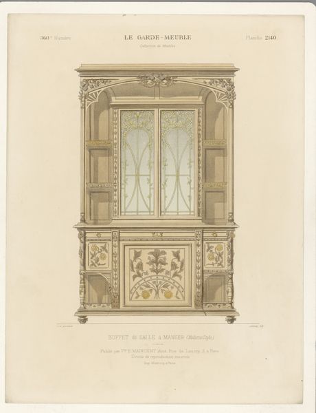 Curator: Editor: This engraving, entitled "Buffetkast," created sometime between 1885 and 1895 by Léon Laroche, depicts what looks like a meticulously designed china cabinet. It’s… striking how detailed it is, almost like an architect’s blueprint, but for furniture. What draws your attention most about this piece? Curator: My focus is drawn to the object’s creation; how does the means of its production inform our understanding? It's labeled "Buffet Louis XIV" indicating an aspirational reproduction or revival. But consider the materiality: it's a print, not the actual crafted wooden cabinet. Editor: So you're thinking about the labor involved versus what it represents? Curator: Precisely! We must consider how a culture values and portrays handcrafted luxury items versus the industrial techniques that depict and perhaps distribute images of such things. Also, think about this piece of paper as commodity, made possible by specific modes of printing production at this historical moment. Does this reproduction enhance or diminish the "aura" of the Louis XIV style buffet? Editor: That’s interesting; I was just thinking about it as an image of something beautiful. I hadn't considered its actual value. Curator: Right! It is not simply a document of history. It also shows its historical moment through printing techniques and modes of valuing consumer products in the late 19th Century. So how might considering the historical moment of the artwork, and it's mode of production, give insight? Editor: Now I see it offers layers of interpretation, revealing as much about the society that created the print as it does about the original buffet style itself! Thanks! Curator: Indeed! By examining materiality and methods of production, we go beyond the image and delve into cultural meanings of this beautiful furniture object in a time of industrial manufacturing and mass consumerism.