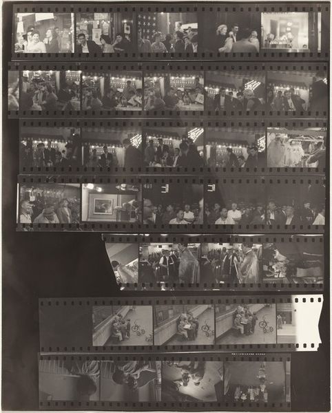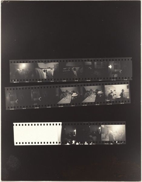 Curator: This gelatin-silver print, titled "Jazz musicians--New York City B", comes to us from photographer Robert Frank, likely snapped around 1957 or 1958. Quite a glimpse into a bygone era, wouldn't you say? Editor: Definitely, and right away, the stark contrasts and the way the frames are laid out give off this amazing sense of frenetic energy, a rhythm almost visible. Does that resonate for you at all? Curator: It certainly does! The presentation as a film strip really emphasizes movement and time. Notice how each frame seems to capture a different beat, a subtle shift in the performance. The subjects are these shadowy figures, perpetually in action, mid-note, or perhaps even just preparing to unleash their musical souls. It feels almost dreamlike. Editor: Right, the film strip presentation. You know, the sequential arrangement evokes structuralist themes. It hints at underlying systems of order even amidst the seeming spontaneity of jazz itself, which can seem so elusive to capture in still images. There's a push and pull between representation and the actual performance here, wouldn’t you agree? Curator: Precisely. Robert Frank was always chasing that authentic, raw emotion. This feels like an attempt to freeze that fleeting moment, that intangible magic. And in a city like New York at the time, brimming with creative explosion… It almost physically manifests that burst of energy through the photograph, and its structure. Editor: Yes. And you also feel the social commentary, woven so tightly into the photographic form. It almost embodies the anti-establishment mood of the Abstract Expressionists. This idea of challenging and expanding traditional notions of art feels intrinsically tied to how it depicts music, a force of radical, spontaneous reinvention that was really taking hold during this era. Curator: I think so too. It's like Frank wasn’t just photographing jazz musicians, he was capturing a vibe, a spirit, that raw, unfiltered… humanity. Even with the slightly gritty monochrome finish, the photograph remains imbued with warmth. Editor: A beautiful insight. The structure here acts as both framework and, maybe even cage: offering and at the same time trapping brief flashes of insight in equal measure, and asking questions about jazz, life, the capturing and presentation of creative forms. Curator: Absolutely, making it all the more captivating to experience. Editor: Agreed. What an interesting, insightful piece!