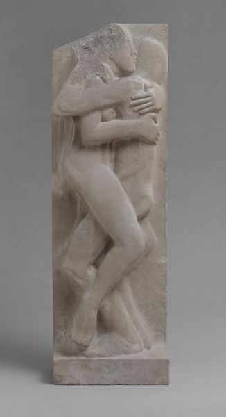 Editor: We're looking at "The Springtide of Life" by William Robert Colton. The cool marble gives the figures a pristine feel, almost frozen in time. What compositional elements stand out to you? Curator: The artist’s manipulation of the marble surface is noteworthy. Notice how the texture varies, creating a contrast between the smoothness of the figures and the roughness of the base. Consider also the implied lines—the gaze and posture of the figures—and how they guide our eyes around the sculpture. Editor: So it's about how the marble itself contributes to the meaning, not just the figures depicted? Curator: Precisely. The cold, hard stone juxtaposes the softness and vulnerability of youth, provoking a deeper contemplation on the transient nature of beauty and innocence. Are these forms truly representational, or do they lean towards abstraction? Editor: I see it now, it's like the marble is almost another character! Curator: Indeed. Form and material coalesce to elevate this work beyond mere representation.