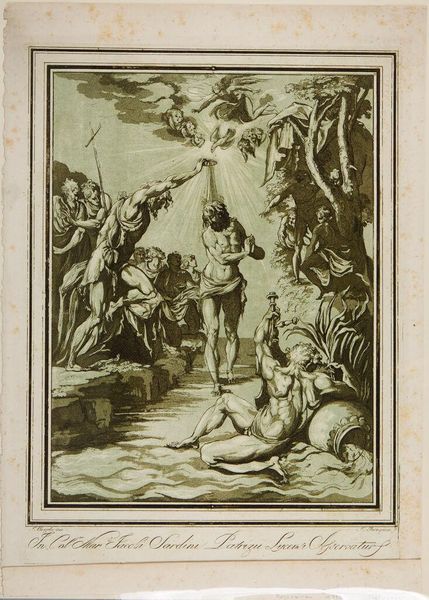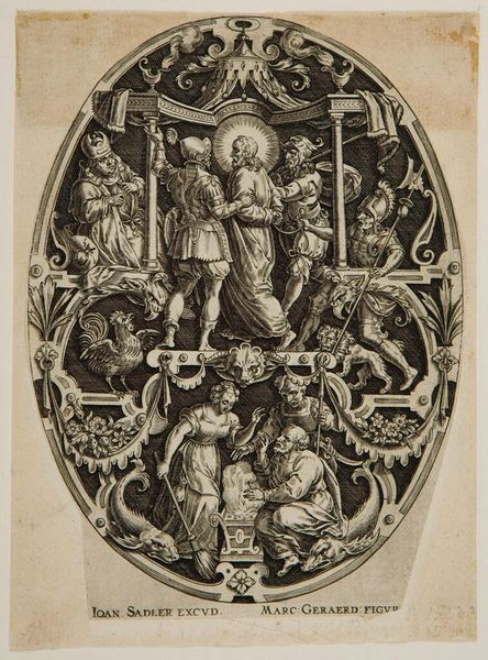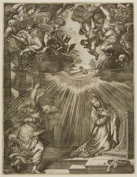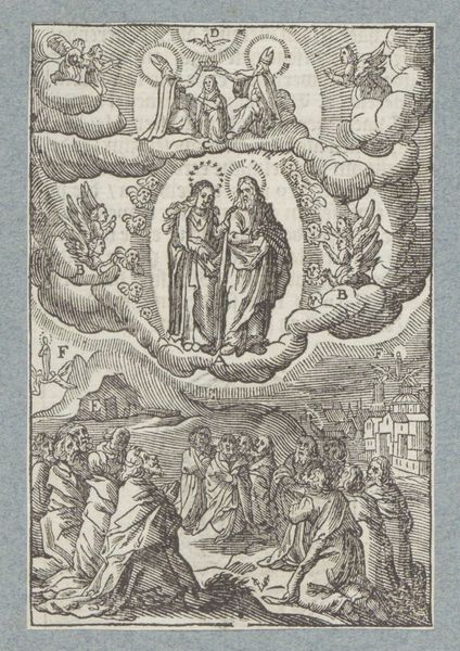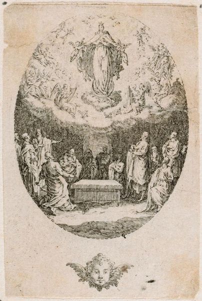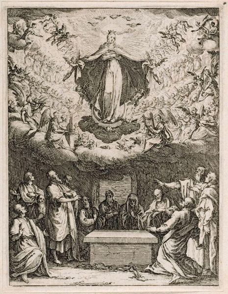 Editor: This intricate etching, "Assumption of the Virgin" by Jacques Callot, depicts the Virgin Mary ascending to heaven. It's amazing how much detail he packed into such a small print. How do you read the composition? Curator: The composition is structured around a clear division: the earthly realm below, with the apostles gathered around what appears to be a tomb, and the celestial sphere above, swirling with angels. Observe how Callot uses line to differentiate texture and form. Editor: The contrast between the dense activity at the top and the relative stillness at the bottom is striking. Is there a deliberate intention behind this? Curator: Indeed. It guides the eye upwards, emphasizing the Virgin's ascent. Note the strategic deployment of light and shadow, the darker tones anchoring the base, leading to the ethereal brightness surrounding the Virgin. Editor: That makes the narrative much clearer. I've certainly learned to appreciate the balance between the earthly and heavenly, and the linear techniques employed.