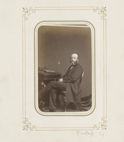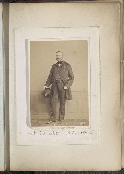 Curator: Here at the Rijksmuseum, we have an albumen print titled "Portret van een staande man met hoge hoed," dating from 1860 to 1894, attributed to Ghémar Frères. What are your initial thoughts? Editor: It’s austere. The gray tones flatten the figure somewhat, but it’s the formality of the pose that really strikes me. There is a tension between what is revealed and what is concealed. Curator: I see it as a study in controlled composition. Notice how the vertical lines of the curtain, the wall paneling, and the man himself create a sense of stability. The slight curve of his coat mirrors the arc above, in a clever alignment that stabilizes the pictorial field. The high hat serves as a counterpoint, drawing the eye upward. Editor: I am interested in the choice of albumen as the printing method. What was its particular appeal during this period? And albumen requires a very thin coating of egg whites – a messy and smelly affair to produce these photographs! What does the materiality of that production suggest to us about this era’s values surrounding portraiture? Curator: Albumen prints allowed for finer detail and a wider tonal range, providing a degree of verisimilitude then unmatched, enhancing the image. The high degree of crispness amplifies the reading of the subject as an individual, worthy of prolonged contemplation. Editor: Precisely, this individual, like many from the burgeoning middle class, understood that this particular photographic method provided an aura of status. By literally embedding oneself in egg, one created an elaborate symbol of class aspiration through a novel technology that elevated the individual above the mess of the social fabric. Curator: I hadn't considered the social aspirations encoded in the albumen print itself. Interesting. Editor: In that way, the photograph almost ironically gestures beyond the constraints of the figure standing there—the materiality speaks loudly to production, class, and the performance of one's place within the 19th century. Curator: Indeed. It's a testament to how even seemingly straightforward portraits can reveal intricate layers of meaning when examined through different lenses.