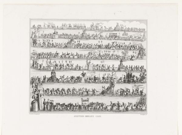 Editor: Here we have an engraving from 1845 titled "De Optogt van Graaf Floris V. voorgesteld door de H.H. Studenten van Leyden op den 8 Februarij 1845," which depicts a historical procession. It feels like I'm looking at a tapestry of tiny figures and horses. It's meticulously detailed but the perspective feels...unconventional. What's your take on this? Curator: Observe the line work. The engraver has created depth through variations in line weight and density, though, as you mentioned, not through traditional linear perspective. It's intriguing how the artist uses horizontal registers, almost like stacked friezes, to convey the scope of the procession. Editor: So, it’s more about capturing the essence of the procession rather than a realistic depiction? Is there a reason the artist chose this arrangement? Curator: Precisely. The emphasis is on the rhythmic repetition of figures and forms. Note how each layer, though similar, presents subtle variations in costume and posture, adding to the overall visual texture. Consider the print medium; what effects is it able to achieve? What does it prevent? Editor: The line work gives it a certain clarity, but perhaps at the expense of a more dynamic composition. I see that the repeated figures, despite their similar appearance, give a feeling of a specific representation with many, various actors. Curator: The limitations of engraving at the time led to a kind of stylistic shorthand. Look closely and there is clear individual variation if you are able to identify it through the details and lines themselves. It's less about precise representation and more about conveying a symbolic order. What would happen if we extracted one section from the larger print? Editor: Interesting. Analyzing its formal elements makes me see how the artist prioritized conveying historical detail and a sense of organized grandeur over realistic perspective. I will certainly appreciate that when thinking about composition in this print. Curator: And I find the tension between meticulous detail and symbolic representation makes for a visually rich, and intellectually engaging work, now that you point that out.