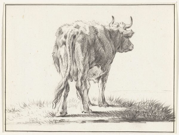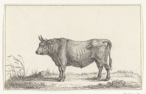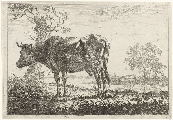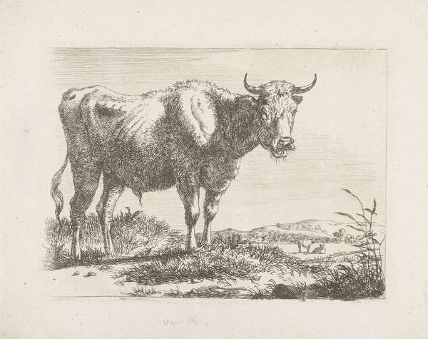 Curator: So, here we have Jacobus Cornelis Gaal's "Standing Bull," etched in 1851, here at the Rijksmuseum. Quite the specimen, wouldn't you agree? Editor: Imposing! Though he also looks a little... weary? Not quite the triumphant beast I expected. He is alone in the fields, under a flat grey sky. Curator: Well, it is a study in realism, wouldn't you say? Gaal seems intent on capturing the bull's raw physicality. See the careful etching capturing his musculature and the texture of his coat? It's like a farmer taking stock of his prize animal. Editor: I see a kind of vulnerability, maybe, and that single bull is a symbol. Cattle throughout history, like this one, are not just sources of power and food but ancient totems representing virility and strength. Notice his head is bowed, a universal signal, indicating contemplation, almost sadness. Curator: An interesting reading! It feels more like practical observation to me; noting posture, size. And it’s such a humble scene too—no drama. Just the bull, some scrubby plants, birds in the distance. He's simply existing. Perhaps there’s an honesty to that portrayal. The bull simply IS. Editor: But, the simplicity enhances its symbolic weight. Landscape often functions as a container for the psychological state. Here, the bull feels confined not just by the composition but the somber mood as well. It's about an earthbound creature connecting to human perception, to land ownership. Curator: Maybe. I think you read deep into the semiotics! To me, it shows more that life isn't always spectacular. Editor: Life, no; art, yes. Curator: It’s true: that little scene does strike something profound despite it not being grand. It pulls at us because, while the bull is a subject here, in this very spot we know what it symbolizes at the same time. Editor: Yes. This little print expands outwards in ways that I feel were deliberately planted by the artist.