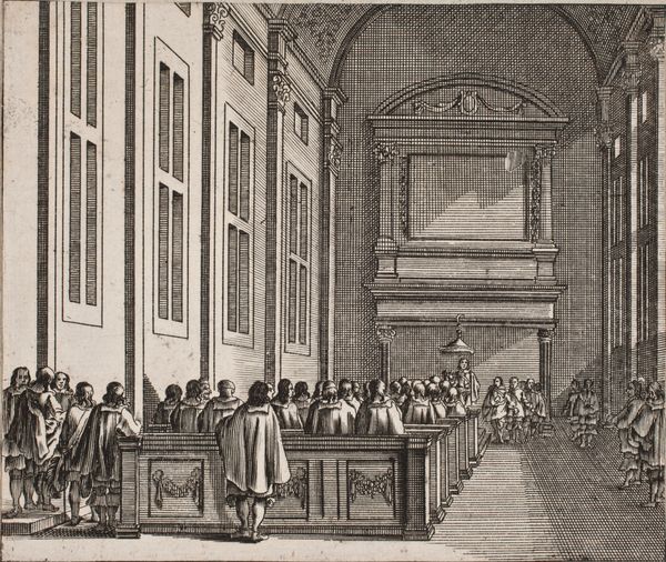 Editor: So this is William Hogarth’s "Frontispiece to Nicholas Amhurst's 'Terrae-Filius,'" made as an engraving in 1726. It's packed with figures within what looks like a university hall. It’s quite chaotic, almost like a staged disruption. How do you read the social dynamics in play here? Curator: Hogarth often used his art to critique social institutions, and this piece is no exception. Knowing it’s a frontispiece for "Terrae-Filius," a satirical journal about Oxford University, the chaos becomes clearer. This isn’t just any disruption; it’s a deliberate mockery of academic authority. Editor: So the figures causing a ruckus... they’re intentionally undermining the seriousness of the setting? Curator: Precisely. Consider the context: The early 18th century in England was a time of increasing social and political satire. Hogarth positioned himself as a visual commentator. He questioned the value systems upheld by powerful institutions. Are these students or faculty acting out? Editor: Looking closely, some figures appear to be throwing objects, while others seem to be gesturing wildly towards the figures seated higher up, the ones on display. Curator: Yes, the composition emphasizes this divide, visually representing the power structure within the university. Who do you think the author or target audience was for Amhurst's satirical publication? Editor: The students perhaps? So maybe this frontispiece was trying to attract like-minded thinkers? This image offers so much more depth when you know what the social climate was like. Curator: Exactly. Hogarth isn't just depicting a scene; he's contributing to a larger conversation about power, authority, and the role of satire in society. It really gives me an incentive to revisit other work by Hogarth now.