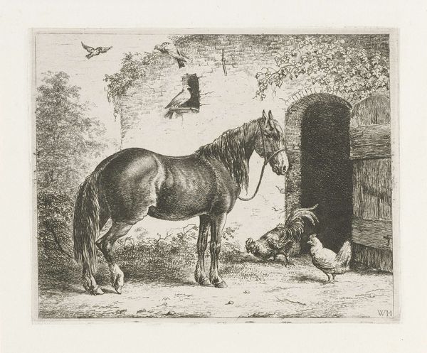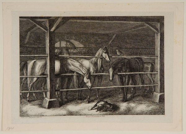 Editor: This is Théodore Géricault's "Hanoverian Horse," a print at the Harvard Art Museums. There's a stillness to it, like a posed portrait. What stands out to you? Curator: The print offers a glimpse into the socio-political role of equestrian imagery. Horses, particularly those of Hanoverian breed, were potent symbols of aristocracy and power. Editor: So, the horse isn't just a horse? Curator: Precisely. Consider how Géricault, even without explicit context, subtly reinforces established hierarchies through his artistic choices. The groom's placement, his attire—all contribute to a narrative of class and control. How does that reading resonate with you? Editor: It shifts my perspective; I was just looking at the pretty horse! Thanks. Curator: It's a reminder that art often operates within—and comments on—existing social structures.