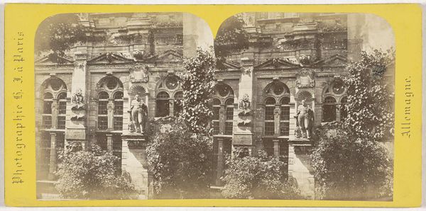 Curator: This stereoscopic photograph captures the cloister of the Jerónimos Monastery in Belém, Lisbon, sometime between 1868 and 1890. Note the vantage point, which is key to understanding this work as more than mere documentation. Editor: It's serene. The light and shadow create this peaceful rhythm as your eye moves through the arches and into the garden, even in monochrome. The symmetry emphasizes the building's groundedness, yet it almost feels ethereal because of that aged photographic print aesthetic. Curator: The very architecture of the Jerónimos Monastery, built in the Manueline style, represented Portuguese power and maritime exploration during the Age of Discovery. This image appears during a later period of photography's growth as it becomes a source for representing political power. These photos could disseminate images of Portugal’s glorious past and cultural relevance on a European scale. Editor: And look at the gardens. The layout is rigid, reinforcing this feeling of controlled space and imperial reach. In a place of supposed solitude and reflection, we see this very deliberate shaping of nature— a mirror, perhaps, for the shaping of ideologies. Were these images, created and collected, complicit in advancing a colonizing agenda? Curator: Absolutely, that tension is palpable. The monastery itself, initially populated by monks devoted to guiding sailors and praying for the king's soul, served a crucial function in the maritime expansion. Photography became a means to freeze such establishments in time. Editor: How do you think viewers today, removed from that initial intended audience, interpret images like these? The architectural beauty still captivates, of course, but I hope people also question whose stories are being told. It calls for understanding history through both a critical and an aesthetic lens. Curator: Precisely, and recognizing the evolving roles of the museum in shaping such historical narratives. Editor: Indeed, and the need for critical discourse in today’s landscape where this photograph offers an opportunity for understanding and resistance.