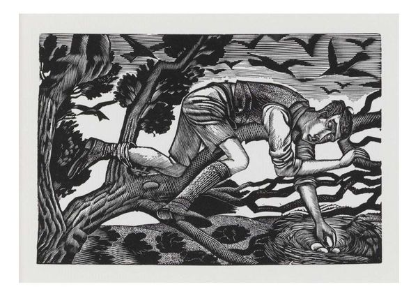 Albert Huie created this compelling woodcut print, "Family", in 1960. As a print, this work exists as one of many, inviting questions about labor, production, and value. Huie carves away at a block of wood, leaving a design in relief, which is then inked and pressed onto paper. Look closely, and you can see the linear quality and texture of the wood itself. The stark contrast between black and white creates a dramatic effect, focusing our attention on the forms and figures represented. The image shows a mother and child amidst a landscape of lush vegetation and other figures. The process of woodcut requires time, patience, and precision. Each cut into the block is a deliberate act, contributing to the overall composition. In this way, "Family" reflects a deep engagement with both the material and the subject matter. Huie’s work encourages us to look beyond the surface, recognizing the labor and skill involved in its creation, and to appreciate the social context in which it was made.