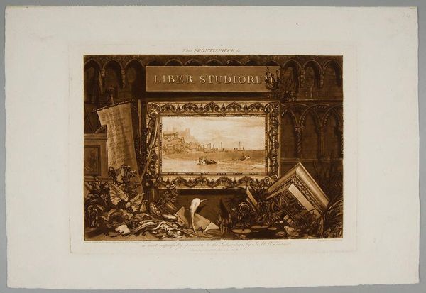 Curator: This is Joseph Mallord William Turner's "Frontispiece," an etching residing here at the Harvard Art Museums. It sets the stage for his 'Liber Studiorum.' My immediate impression is one of controlled chaos, would you agree? Editor: Absolutely. It's a visual manifesto framed by, well, everything! We see fragments of classical architecture, flora, and the name of the series: 'Liber Studiorum' boldly declaring its presence. The etching evokes a sense of history and knowledge. It situates Turner's landscapes within a broader cultural context. Curator: Turner's landscapes are famously turbulent, emotional. The etching is like a theatrical curtain raising, leading you into a world of feeling and natural power. Editor: Yet, this very "natural power" was, at the time, intertwined with colonial expansion. The seas and landscapes depicted were often sites of exploitation. Does Turner acknowledge this? Does the etching grapple with the violence inherent in the picturesque? Curator: That’s a perspective I can appreciate! Ultimately, I think he wanted to show us that art is more than just a pretty picture; it’s a gateway. Editor: Yes, a gateway that demands we unpack its historical baggage.