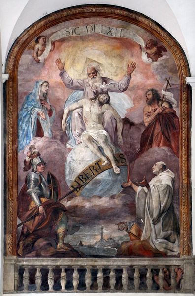 Editor: So, this is "Madonna and Child Appearing to Saint Philip Neri," painted with oil after 1725 by Giovanni Battista Piazzetta. The scale of this piece is striking, but I'm curious about what lies beneath this rather dramatic presentation. What catches your eye in this work? Curator: Oh, you know, first it's the theater of it all! This isn't just a quiet devotion; it’s a full-blown celestial opera! Look at the saint, bathed in this divine spotlight. And then you have Mary and Jesus, popping down for a visit as though this happens every Tuesday. But seriously, consider the Baroque period. Everything's exaggerated for a purpose: to move you, to convince you of something bigger than yourself. Editor: So it's about more than just the religious narrative? Curator: Precisely! It's about power and persuasion. The Church used art like this to inspire faith, but Piazzetta—clever chap—plays with your emotions. You get the awe, but he also sneaks in this...this intense humanity. See the angels peeking from behind the clouds. They add that sweetness and accessibility. Don’t you find it amazing? Editor: I hadn’t noticed before. So that humanizes the scene. I suppose the skull and the hat pull the viewers to earth a little. What should a modern viewer make of this "celestial opera"? Curator: Think of it as less a historical artifact and more as a study in contrasts. We have death lurking beside divine glory, the earthly rendered next to ethereal beauty. Piazzetta isn’t trying to sell us on religion but on feeling – an awakening, maybe. The scene allows viewers to meditate on our values, what matters, which gives it continuing relevance. Editor: Well, I never thought of it that way. Thanks! It definitely gives me a new perspective. Curator: Anytime! Keep questioning; art thrives on curiosity.