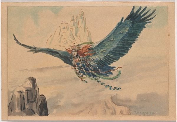 Editor: So here we have what I understand is "Death of an Eagle" by Wilhelm Kotarbinski, though the date is not known. Painted with oils, the scene depicts the fallen eagle pierced with an arrow amidst jagged rocks and circling birds, creating a stark image, rather grim, even. What do you make of it? Curator: Well, it strikes me as both romantically tragic and darkly humorous, if that’s not too morbid! The drama, that grandiose "THUD" of a fallen symbol—but then those rather opportunistic ravens circling! Are they mourning, or merely planning the buffet? And is that a little smirk on the rock where one is perched, observing? It asks, doesn’t it, where does glory truly lie, when confronted by gravity, quite literally. Do you sense any other contradictions, looking closer? Editor: I see your point, there is a certain dark humour with the rock. Perhaps the size of the Eagle creates this grandeur but paired with this crude arrow and dark sky... The idea of glory and its brutal end resonates deeply. How do you think this Romanticism painting fits into his overall collection, and the political or cultural context, if known, from which this originated? Curator: Context, true, offers extra colours, but in its stark lines—doesn't it hint at cycles, at empires falling, hubris meeting inevitable humbling? Perhaps the painter meant a straightforward lament; perhaps it's richer, wry, seeing vultures at the victory parades. The real question: which flavour death do *we* taste when viewing? Editor: That really gave me something to consider – the ‘flavour’ we take away speaks volumes about our own viewpoints and expectations when experiencing this image. It’s a much more interactive piece than I initially assumed! Curator: Exactly! And perhaps *that*’s the trick – artworks showing us more of ourselves, rather than of “eagles,” glory—or supposed ends! A delightful dance of mirrors!