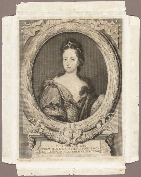 This is Johann Georg Wille's portrait of Elisabeth Auguste von Pfalz-Sulzbach, made using engraving techniques. The image is not drawn, but rather cut into a metal plate. Consider the labor involved in this process. Every line, every curve, meticulously carved to capture the likeness of a noblewoman. The material, metal, demands precision and control, a mastery of tools and technique. Think about the engraver, bent over his workbench, translating flesh and fabric into a language of lines. This wasn't just about representation; it was about skill, about the transformation of base metal into a vehicle for status and power. The sharp lines create a sense of formality, while the tonal gradations suggest the luxurious fabrics worn by Elisabeth Auguste. The print is more than just an image, it's the result of human effort, a testament to the enduring power of craft.