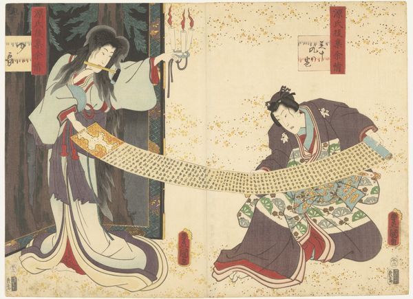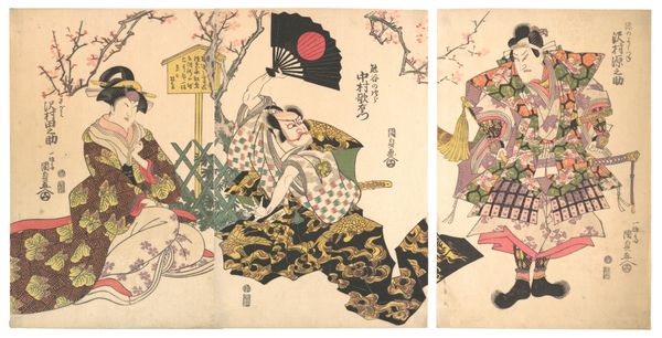 Hasegawa Sadanobu created this woodblock print of actors beneath cherry blossoms in 19th-century Japan, a time when the country was experiencing social and economic changes. The print depicts actors, who were often celebrities, yet they occupied a marginal position in the rigid social hierarchy. The Kabuki theatre provided a space where gender roles could be explored and sometimes subverted. Look closely at how the figures are dressed and posed; Sadanobu uses clothing and accessories to signal aspects of gender and status. The delicate cherry blossoms contrast with the dynamic poses of the actors, perhaps mirroring the fleeting nature of fame, or the transient beauty of life. The imagery suggests a complex interplay between public performance and personal identity, inviting us to reflect on how we, too, perform different roles in our lives. The actors express a range of emotions and experiences, and allow us to explore themes of identity, social status, and the ephemeral beauty of life.