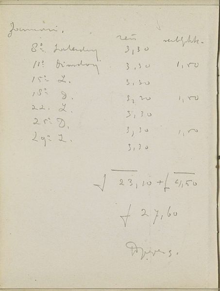 Editor: Here we have "Notities betreffende de zalen van het schip 'Grotius'," a mixed-media drawing from around 1906 by Carel Adolph Lion Cachet, currently held at the Rijksmuseum. What immediately strikes me is the raw, almost scribbled nature of the handwriting, covering the aged paper. What can you tell us about this work? Curator: The textural density is quite remarkable, isn’t it? The contrasting weights of the line create a compelling surface. Notice how the artist uses the entire picture plane. The writing becomes an almost abstract element, don't you agree? Consider the way the marks accumulate; do they form any compositional harmony despite their spontaneous execution? Editor: I see the composition, although unplanned, utilizes balance in both columns, and also negative space for the overall "dirty" aesthetics. I am particularly interested in the connection between function and appearance, why it seems this work could serve as art or writing for everyday use. What could this tell us about the author's intent, the form, and the art itself? Curator: Excellent questions. Function indeed shapes the form. The utilitarian origin is inescapable; it is a document, a list. Yet, the artist's hand transforms it. Look at how certain words are emphasized, enlarged. Observe the numerical calculations and the ruled lines crossing out. These visual rhythms elevate the record beyond mere utility into something that transcends, inviting semiotic consideration. Editor: I'm starting to see it, so, focusing on line and form reveals the hand of the artist, transcending the document's original mundane purpose? Curator: Precisely! The crude aesthetic embodies an inherent structure, one in which it transcends functionality to achieve beauty. I find myself returning to the unique forms themselves rather than their meaning or context. Editor: I see how your perspective enhances the drawing’s intrinsic artistic merits. This work has so much more to it now! Curator: Agreed. It shows the fascinating intersection where art and life become inseparable through formal means.