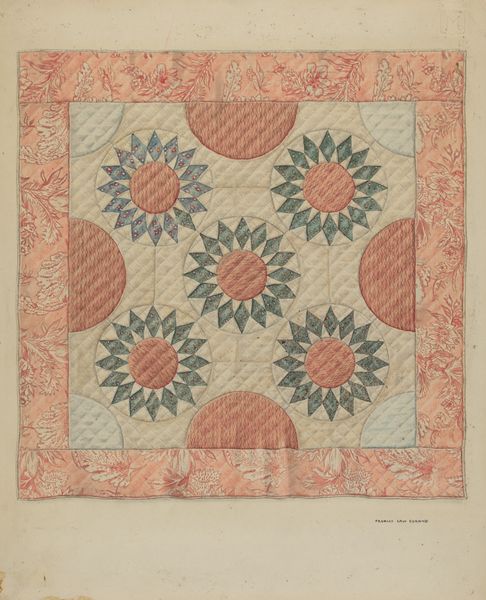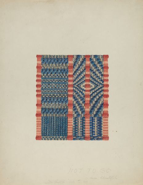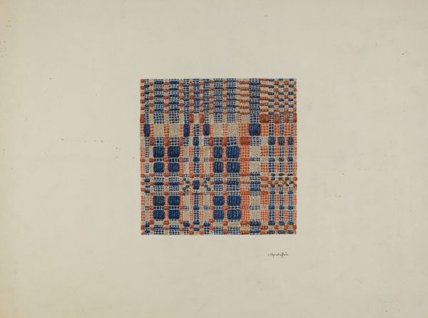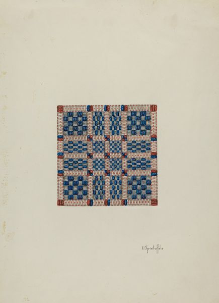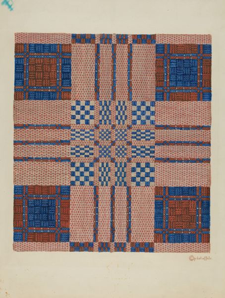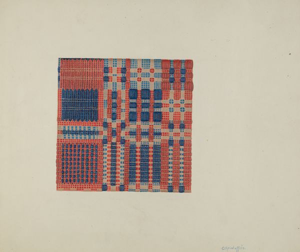 Curator: Here we have "Coverlet (Reverse Side)," a textile design likely created around 1936 by Ruth M. Barnes. The medium combines drawing with textile work. Editor: It's striking how graphic it is, almost like a minimalist painting. The balance of color and shape generates a powerful sense of visual order and material sensibility. I would assume its geometry lends itself beautifully to various iterations, too. Curator: Geometric patterns in textiles carry deep symbolic weight across many cultures. We can see similar motifs in indigenous weaving traditions and folk art throughout the world, designs connecting individual artisans to long traditions of craftsmanship and communal meaning. This one reads to me almost as a deconstructed quilt pattern, retaining an echo of domesticity. Editor: Interesting point. However, for me, this feels decidedly non-domestic. See how the drawing emphasizes hard edges? It’s almost brutal in its stark simplicity, each textural block meticulously positioned. Note also that by limiting her color palette and intensifying form, Barnes accentuates our focus on shape. Curator: Indeed. Color holds emotional weight here, doesn't it? The choice of these somewhat muted blues and reds perhaps suggests a desire for warmth tempered by reserve. It also perhaps hints at an effort toward simplicity born out of constraints common to the 1930s and, to be sure, still relevant today. Editor: Good point. And that reminds me of the grid’s internal architecture. By deconstructing her square even further, Barnes creates another image and set of shapes. You begin to understand that a coverlet pattern and function—indeed the social status often given textiles, even when deconstructed and isolated here, is always changing, and with it so too are the artwork’s forms and intentions. Curator: It underscores how the functional can contain sophisticated aesthetic and cultural information. Appreciating something like the humble coverlet also enriches our sense of social belonging by preserving what, at first glance, may have seemed only functional, useful and ultimately dispensable. Editor: Very true. Well, this has provided a lovely lens into form and symbol through something easily overlooked!