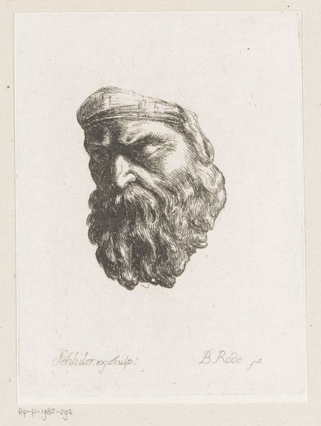 Curator: This is "Mask from the Courtyard of the Zeughaus, Berlin" by Christian Bernhard Rode. Editor: Right away, that intense shadow gives him such gravitas. Makes me think of hidden wisdom, doesn't it? Curator: It does. Rode, born in 1725, was deeply involved in the artistic and intellectual circles of his time, and this etching exemplifies the taste for classical forms. The Zeughaus was an armory, after all. Editor: Interesting. I can see the stoicism, but with a touch of the melancholic artist too. The crosshatching in his beard gives it so much texture! Curator: Yes, the etching technique allows for fine detail, and Rode uses it to create a sense of depth and drama, nodding to the building's role in civic life. Editor: Looking at it, I feel a strange mix of awe and sadness, as if I'm glimpsing some ancient burden. Curator: And perhaps that's Rode's intention: to remind us of the weight of history, etched in every line. Editor: It’s a small piece, but its impact is definitely larger than life.