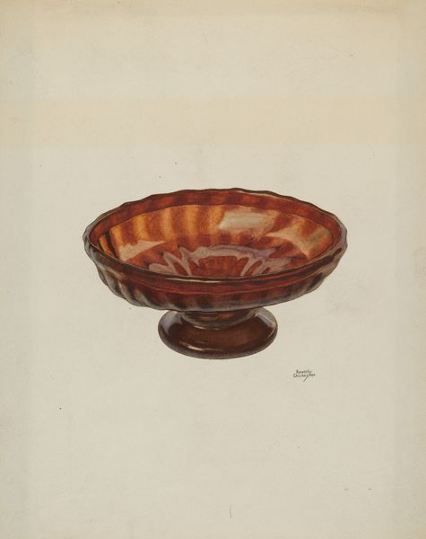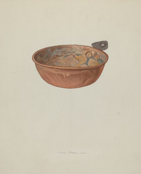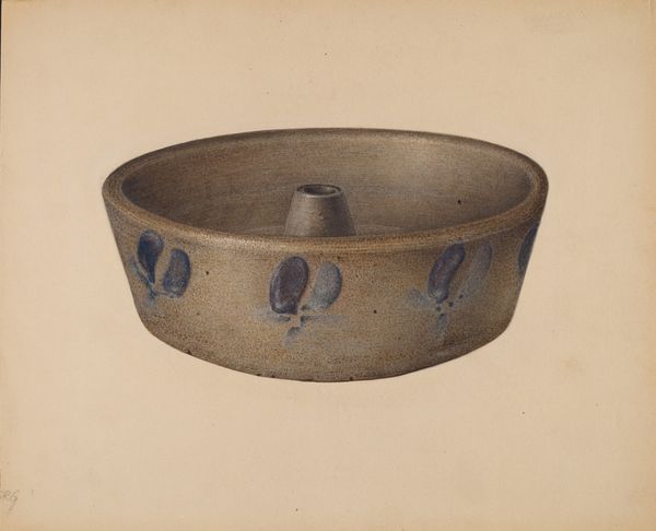 Editor: So, this is Edward White’s "Economy Pie Plate," done around 1937, using watercolor and drawing. It's just a simple depiction of a pie plate, but there is a comforting, homey feeling. How would you interpret it? Curator: What strikes me is the title juxtaposed with the medium. Watercolor, a traditionally 'fine art' medium, is used to depict a utilitarian object: an "economy" pie plate. How does elevating this humble, mass-produced item challenge our traditional art historical categories? Editor: That's interesting, I hadn't thought about it like that. So you're saying that the act of creating a detailed drawing of a common dish challenges the definition of ‘art’? Curator: Exactly! Think about the 1930s: mass production, the Depression. Everyday objects were becoming standardized, divorced from craft. White focuses our attention back on this specific object, immortalizing its design, but also making us reflect on its place in the American home and marketplace. What can we infer about class, labor, or domestic life? Editor: Maybe he's highlighting the beauty that can be found in everyday items, and it is an interesting social statement. Almost elevating its social status, immortalized in an art gallery? Curator: Precisely. By depicting something mass-produced with such detail and care, White prompts us to consider the value of labor, even that involved in the creation of something seemingly insignificant. What statement is the artist trying to make here by emphasizing labor? Editor: It’s almost as if he's giving the plate a sense of personality that transcends the humble clay and simple production. I am never going to look at a basic watercolour the same way. Curator: Indeed, and consider the labor involved in watercolor itself. A materialist reading reveals that both the subject and the process invite us to value traditionally marginalized forms of labor.
