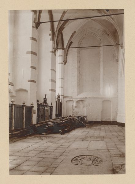 Editor: Here we have "Zaal in het stadhuis van Regensburg", or "Hall in the Regensburg City Hall", captured between 1876 and 1891 by Emil Herbst using photography. The sepia tones give it such an antiquated feel, almost ghostly, but the geometry of the room is very calming to me. What's your interpretation of this piece? Curator: Oh, absolutely! The ghostly aura you sensed resonates perfectly with the weight of history held within those walls, doesn't it? I see it as a tableau of power, meticulously preserved. The long parallel lines of the ceiling, the precise placement of the windows…it all speaks of order and intention, as though the very architecture itself is an extension of governance. What do you make of the light? Editor: I noticed the light is quite flat, almost as if it's intentionally not drawing attention to any particular area. Curator: Exactly! Notice how that muted light subtly diffuses power. Herbst isn't just showing us a room; he's inviting us into a quiet theatre where history perpetually unfolds. It whispers of decisions made, fates decided, under that very roof. Do you get the sense that the photo is a testament to both human endeavour and its inevitable impermanence? Editor: Yes! I now see that the flat lighting doesn't give life but removes life; that's what gives it such a haunting, and quiet, essence! It makes me consider how even powerful spaces will one day succumb to time. Curator: And that's where the art truly lives, doesn't it? In those whispered questions that linger long after we've moved on. Editor: Indeed. This photograph asks a lot, and I find I have many new answers now! Thank you.