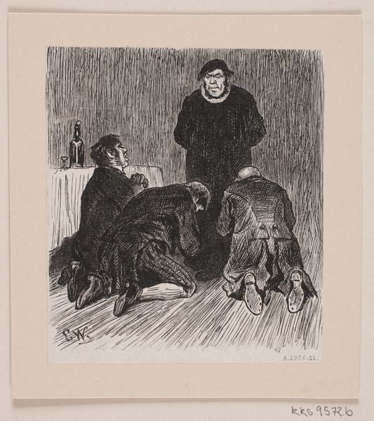 H.P. Hansen made this illustration for "Kulbrænderen," using black ink to create an atmosphere charged with social critique. Hansen lived during a time of significant social and political change in Denmark, including the rise of industrialization and growing class divisions. Here, we see a clergyman standing imposingly over three kneeling men. The bare feet of the men suggest their lower social standing compared to the clergyman, who appears to be in a position of power. The setting, with its stark background, might reflect the difficult lives of the lower classes, contrasting with the clergyman's apparent authority. Illustrations such as this provided commentary on social dynamics, questioning traditional power structures. The emotional tension in the scene, captured through the body language and facial expressions, invites us to reflect on themes of obedience, authority, and social disparity. The illustration serves not only as a narrative depiction but as a critical reflection on the societal norms of Hansen’s time.