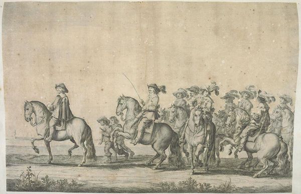 Curator: Pieter Nolpe brings us "Group of Courtiers on Horseback, Second in File Gesturing and Looking Back," a striking image rendered on a sheet measuring roughly 31 by 47 centimeters. The medium appears to be printmaking. Editor: It strikes me as a tad...rigid, wouldn't you say? Like a theatrical tableau, everyone in formation. Curator: Precisely. The composition leverages a linear arrangement to emphasize the uniformity and status of the courtiers. The intricate hatching creates tonal variation, defining form and texture across the horses and riders. Editor: But that second figure, turning back—it disrupts the whole effect. Adds a touch of narrative intrigue, doesn't it? Wonder what caught his eye. Curator: His gesture could imply a break in protocol, suggesting a moment of individual agency within the structured order. This tension enlivens the piece. Editor: For me, it's about the unknown. I wonder, what's outside the frame that caught his attention? Curator: Indeed, a subtle disruption of the expected, inviting us to consider the nuances of courtly life. Editor: Well, that unexpected little narrative detour makes it all the more compelling, wouldn't you agree?