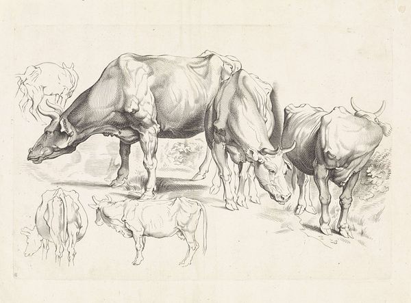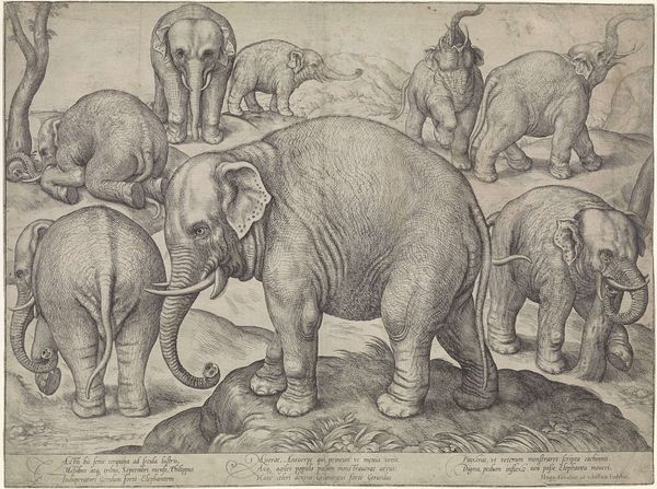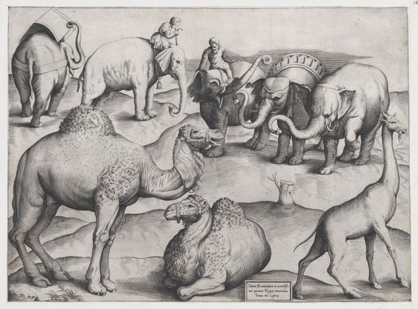 Editor: Here we have "Acht dieren," or "Eight Animals," an engraving made sometime between 1547 and 1577 by Enea Vico, now at the Rijksmuseum. It's…striking. There's such an odd assembly of animals, almost like a parade. What strikes you about it? Curator: Well, immediately, it makes me think about the early modern period’s fascination with and misrepresentation of the "exotic." These animals—the elephants, camels, giraffe—weren’t common in Europe, and their depictions here, while detailed, carry a heavy weight of colonial perception. What does it mean to assemble these creatures together like this? Editor: Colonial perception? Curator: Absolutely. Think about where these animals come from, the regions European powers were beginning to exploit. The "history painting" aspect, as the museum tags suggest, isn't just about recording what these animals looked like. It's about power. The very act of categorizing and displaying these animals reflects a desire to dominate and control the natural world, doesn't it? Where do the human figures fit into that story for you? Editor: I hadn't considered that. The figures on the elephants… are they meant to show mastery over the animals? It's disturbing how nonchalant they seem. Curator: Precisely. This nonchalance naturalizes a power dynamic, disguising the exploitation inherent in their presence. Consider how this image might have been circulated, the narratives it reinforced about Europe's place in the world. What does this "mannerism" stylistic choice do to that messaging, I wonder? Editor: So, it's not just a picture of animals. It's a statement about control, knowledge, and the beginnings of colonial power dynamics being disseminated. It makes me think about how we continue to represent animals, and who gets to tell those stories. Thank you; I’ll never see these old prints the same way again. Curator: Indeed. And reflecting on those continuities is exactly why revisiting these works matters. There’s always another layer to uncover when we engage critically with art's complex history.