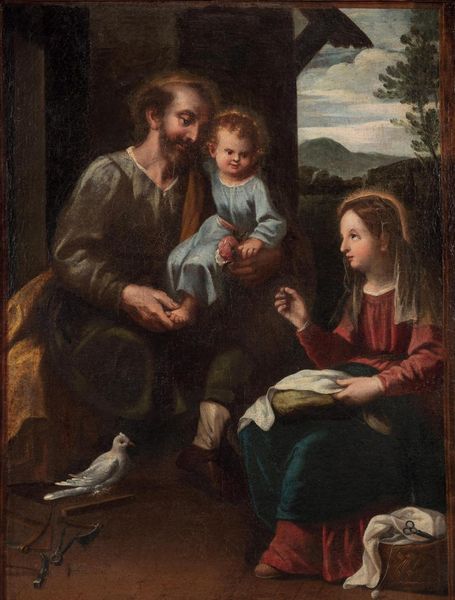 Curator: Alright, let's dive into this depiction of "The Holy Family with the Infant St. John the Baptist," crafted around 1670 by the Spanish master, Bartolomé Esteban Murillo. It's currently held in the Budapest Museum of Fine Arts. What springs to mind for you when you first see it? Editor: It feels incredibly domestic. Not in a boring way, but…grounded. Joseph's literally on the ground with his carpentry, Mary’s sewing, and the kids are playing at their feet. It’s a peek into a divine but recognizable everyday life. A real interior, yet completely staged, in some sense... Curator: Exactly! Murillo was a genius at infusing sacred subjects with warmth and humanity. That said, look closely; can you feel what underpins the apparent ordinariness? For instance, how does St. John’s presence prefigure Christ's future? Editor: The lamb symbol comes to mind. St. John the Baptist is embracing the Christ child and, symbolically, prescient about the Christ's divine purpose on earth. They’re playing with what seems like a shepherd’s staff or some rudimentary cross shape? Curator: Precisely. Murillo employs familiar Baroque-era Christian iconography to amplify a shared sense of intimacy. Consider the gentle luminescence illuminating their faces. It speaks volumes, doesn’t it? Editor: Definitely! It's very deliberate, soft-focused to keep it relatable, yet radiating a higher significance. Did Murillo often include children in his sacred paintings? I love how accessible it makes the scene feel, compared to more severe depictions. Curator: Murillo was indeed celebrated for his portrayals of children. It aligns with the baroque aesthetic and an emphasis on sentiment, empathy and what might be understood by a broad range of viewers. Editor: So interesting how artistic styles reflect the values and beliefs of their time. Baroque as an art historical echo chamber... But it always leaves one wondering what was edited out of the view. Curator: Yes! Perhaps this painting urges us to look at our everyday rituals and to ask what continuity they forge with history or a symbolic realm. Editor: Beautifully put. It's almost a snapshot, in that way—something familiar charged with spiritual weight. Curator: Precisely! Thank you, the way it reframes familiar images certainly stays with you long after you walk away.