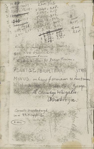 Editor: Cornelis Vreedenburgh's "Notities," dating between 1890 and 1946, is a drawing made with ink and graphite on paper. It looks like the back of a sketch pad filled with notes. What do you see in this piece that I might be missing? Curator: I see more than just preparatory sketches or random jottings. To me, this work offers a glimpse into the artist's creative process and perhaps also the societal structures that shaped their artistic expression. What do you make of the notes on dimensions? Editor: I thought maybe they were notes about potential painting sizes. Curator: Precisely. But let's consider why such meticulousness might have been necessary. During this period, artists often navigated a complex web of patronage, exhibition requirements, and market demands. Do you think these dimensions might represent constraints imposed upon the artist by these forces, or, conversely, Vreedenburgh trying to break such constraints and express freedom? Editor: Hmm, maybe a bit of both? It's interesting to think of even mundane notes reflecting those kinds of pressures. And this almost feels like an intersectional study -- the social pressures interacting with an artist’s identity. Curator: Exactly. And notice the brand of the sketchbook. The commodification of art supplies connects with broader questions of labor and the art market. Think about how access to such materials might have been restricted, and how those restrictions may have marginalized groups throughout the art world. Editor: This definitely gives me a different perspective on the work! It is a peek at the conditions that formed the artist's production! Thank you for illuminating all of this for me. Curator: The pleasure is mine. Examining the seemingly mundane through a critical lens allows us to unearth compelling narratives about the relationship between art, power, and society.