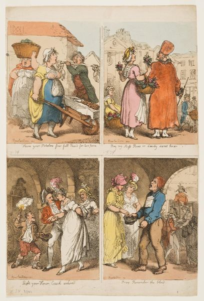 Here is a look at the collection of caricatures, "Vijf karikaturale voorstellingen," created by an anonymous artist. In this amusing array, the artist presents us with scenes rife with social commentary, capturing the follies and foibles of society through exaggerated figures and situations. Note the way figures touch each other. The embrace, the handshake, the grab. Consider the embrace depicted: it echoes the ancient motif of the "Accolade," a gesture seen in Roman art symbolizing peace or agreement. Yet here, the embrace seems more a clumsy lunge, a parody of affection, revealing underlying social tensions. Then we observe the man grasping a woman: this harks back to classical depictions of abduction, yet here it is absurd and comical. How might our collective memory of such gestures influence our interpretation? How does the artist play with these archetypes to critique contemporary society? By engaging with these symbols, the artist taps into a deeper vein of human experience, inviting us to reflect on the timeless dance between comedy and tragedy.