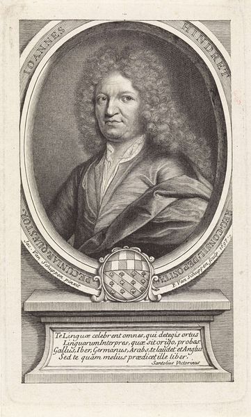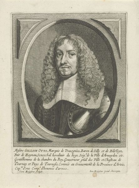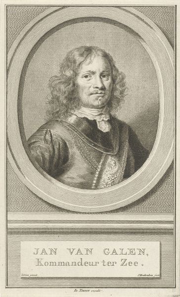 Curator: Oh, what a striking face! There's a real... theatrical quality to the fellow in the frame. He looks like he's stepped straight out of a play. Editor: Indeed! What captures my eye about this work is the institutional framework surrounding portraiture in the 18th century. This engraving, "Portret van Jacob baron van Wassenaer," was created sometime between 1749 and 1759, crafted by Jacob Houbraken, and it now resides within the Rijksmuseum’s collection, showcasing how elite status and artistic representation converged within a museum setting. Curator: An engraving, you say? Fascinating! All those tiny, meticulous lines to conjure up such volume... And, oh, look at the armor. So ornate! There’s such weight, both literal and metaphorical, to the imagery of power here. He’s quite the figurehead. Does anyone know who he *really* was? I find it terribly boring to assume the obvious. Editor: Well, his titles are rather plainly emblazoned below his portrait: “Jacob, Baander-Heer Van En Tot Wassenaer, Luitenant-Admiraal-Generaal der Vereenigde Nederlanden,” and, quite literally, position him within the politico-military hierarchy of the Dutch Republic, symbolizing their legacy through representation, but, the staging, framing him in an oval that hints at Roman precedents, served a very public and powerful symbolic function. Curator: The power dynamics seem almost like a set of smoke and mirrors to me. Maybe the man himself was lovely, warm and fuzzy - he doesn’t come off that way through the print, though, right? Maybe he used his military position as a shield? And perhaps he commissioned this engraving to present that illusion... Editor: Whether he commissioned it, or it was a commemoration after death, engravings like these were mass produced and circulated amongst networks; images and political memory intersect at moments like these in compelling ways! This image doesn’t just show an individual but illustrates how power is presented, interpreted, and then spread to broader audiences. Curator: Well said, truly. I think I could gaze at this dandy forever and find a new facet, a new narrative each time. It's funny how sometimes art reflects us more than them, innit? Editor: Yes, and precisely in those reflections, it challenges us to see what systems endure through the centuries.