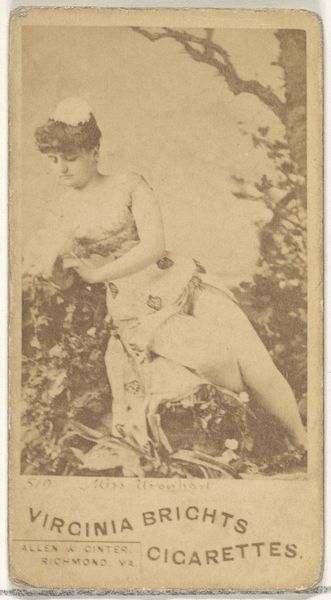 Curator: Here we have a piece titled "Card 642, Pauline Hall, from the Actors and Actresses series (N45, Type 7) for Dixie Cigarettes." It comes to us from Allen & Ginter, and it was created sometime between 1885 and 1891. Editor: It has a somewhat faded, dreamlike quality. The palette is restricted, creating a sense of historical distance. The composition feels very formal. Curator: Indeed. It is an albumen print, a type of photograph printed on paper coated with egg white, popular in that era, which accounts for its unique tonal range. These cards, part of a larger series, served as both advertisement and collectible mementos of stage personalities. Pauline Hall herself was a very well-known singer. Editor: I find the arrangement of forms fascinating. See how the artist uses Pauline's seated pose to create a strong diagonal line, bisecting the frame. Her pale clothing contrasts with the darker background and elaborately patterned fabric. It directs the eye to her face. Curator: It’s interesting that you bring up the textile patterns, as it acts as a marker of wealth. The images sought to solidify her persona, but also the idealized role of women at the time, her association with theater creating a tension between decorum and display. Editor: Perhaps. To me, the most striking element is the overall visual texture—it has an ethereal quality to it. I can also observe an almost tangible softness and tonal delicacy created by this albumen printing. Curator: The popularity of these cards highlights how visual culture rapidly disseminates, creating a shared, accessible iconography. Pauline becomes part of this larger cultural dialogue simply through an accessible item. Editor: From my perspective, that is very compelling. The way she is staged—seated, wearing fur—feels intentionally luxurious for marketing. It speaks to status and glamour associated with both her persona, the theater, and smoking. Curator: These items invite questions of celebrity, commodification, and image construction during a time of huge cultural shifts. The format democratized access, but also dictated new avenues for disseminating ideology. Editor: An incisive reminder that our perception of beauty and status have continuously changed, framed, as we stand in front of it today. Curator: An insight, precisely!