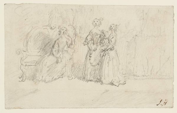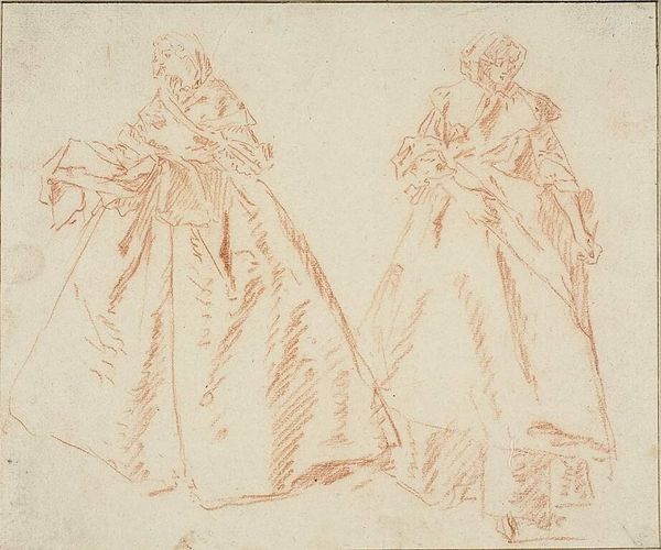 Editor: This is "Study of Two Small Girls," a chalk drawing on paper by Nicolas Lancret, created around 1725. It's intriguing; the red chalk gives the drawing a sense of warmth, almost like looking at a memory. What's your interpretation? Curator: The 'warmth,' as you say, is interesting in light of the social function of art in 18th-century France. Consider the rise of the Rococo style, with its emphasis on playful elegance, a deliberate contrast to the stricter Baroque of Louis XIV's era. Genre paintings and portraits of children were in vogue. What does it mean to represent children this way? Editor: I guess I hadn't considered the politics of it. It's just... a sketch of two girls. Are you saying it's more than that? Curator: Absolutely. Lancret wasn't just capturing likeness; he was participating in the construction of childhood within the elite. These girls are carefully posed, their dresses reflecting status. These 'genre scenes,' seemingly innocent, helped define the era's social codes. Editor: So, the drawing is actually shaping, not just reflecting, how people viewed children? It is quite amazing to think about art as participating and also creating societal changes at the time. Curator: Precisely. And think about where it was displayed – most likely in private collections of the wealthy elite, reinforcing their values and sense of self. Editor: That's fascinating! It gives me a completely different way to think about art. It is like the values get drawn along with the image. Thank you. Curator: Indeed. Seeing art as a product and a producer of social and political meaning transforms how we understand its role.