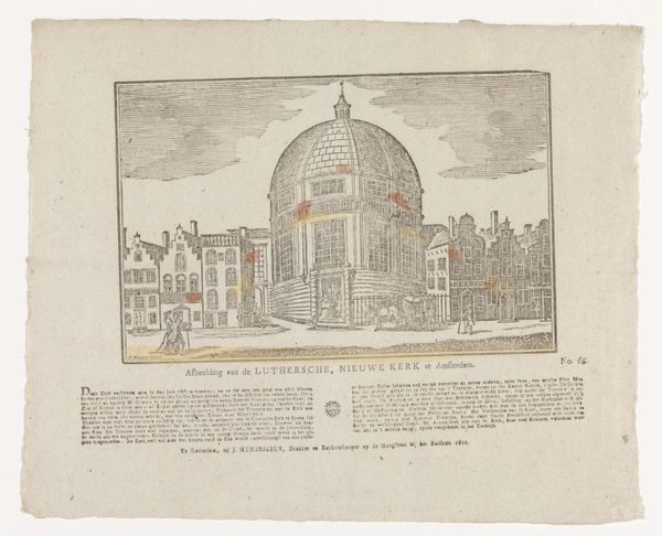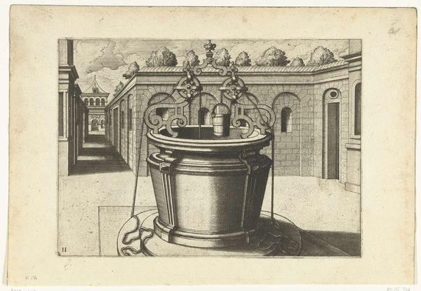 Curator: What immediately strikes me is the quiet stillness—a frozen moment in what feels like a very ordered, miniature city. The light and shadows give it this wonderfully melancholy air. Editor: It’s certainly a fascinating print. We’re looking at "Hoge ronde waterput met ijzeren ornamentale overhuiving en twee pompzwengels," which translates to "Tall round well with iron ornamental hood and two pump cranks," created around 1574 by Johannes or Lucas van Doetechum. Curator: A mouthful, that title! But accurate, I suppose. I keep coming back to how solid the well appears, juxtaposed against the delicacy of the etched lines everywhere else. Editor: Indeed. The production here reveals a keen understanding of materials and labor. Look at how the weight of the well contrasts with the almost lace-like quality of the ironwork. This suggests a complex relationship between necessity—water access—and civic pride displayed through ornate ironworking, which undoubtedly required skilled craftspeople. The print served as a visual record and a form of social documentation. Curator: I see it also as an architectural fantasy, the symmetry almost unsettling in its perfection. There’s a sort of…preoccupation with cleanliness and order. What’s most compelling for me, though, is that the water’s actually pouring, as captured in this very moment of flow—a sense of temporality, amidst all that meticulousness. Editor: Right. The distribution of water, the act of communal drawing…Water wasn’t merely a commodity, but a key component of public life and its distribution a concern for governance. The location, too, tells us this image speaks directly to how people interact within public squares, negotiating space and resources in an emergent urban environment. Curator: That makes me wonder who gathered there, near this grand structure. The etching implies an aspiration toward ideal community living, though, the figures absent make it quite uncanny. A longing perhaps more than representation. Editor: I agree that absence speaks volumes. By detailing these specific elements, from ironwork down to bucket size, the artist highlights the increasing complexity and material culture of urban life. Curator: Looking at this scene with all its layers, I find myself pondering: water—a fundamental need meets decorative metal. Art mirroring the social systems needed to meet our most vital material requirements. Editor: A final thought for me would be on how a seemingly mundane object has, through meticulous and skilled depiction, evolved into a lasting and captivating comment on society.
