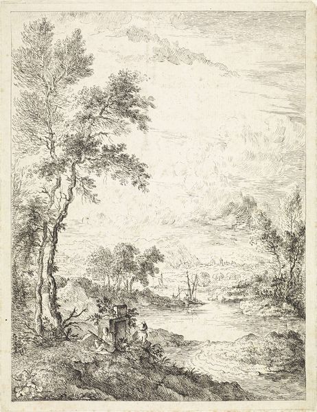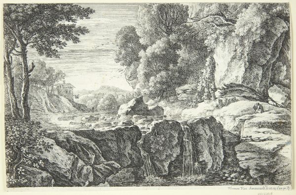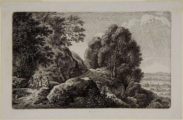 Curator: Albert Christoph Dies created this etching, "Ponte Lupo, Tivoli." Editor: It feels almost like peering into a memory, doesn’t it? The way the light and shadow play… Curator: Indeed. The Ponte Lupo, or Wolf Bridge, has held symbolic weight for centuries, representing the wildness and untamed nature outside of Rome. Editor: And the tiny figures, they seem to emphasize the overwhelming power of the landscape, like little actors on a grand stage. Curator: Just so, that contrast is essential. It reminds us of humanity's small place within the broader tapestry of the natural world. Editor: I'm left feeling strangely peaceful, despite the wildness. Curator: Perhaps because these enduring landscapes remind us of a shared, continuous past.