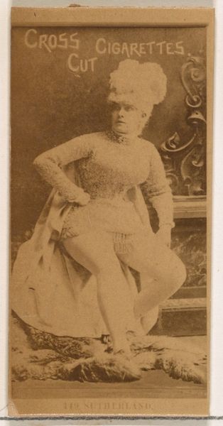 Editor: So, this albumen print from the 1880s, titled "Card Number 764, Lulu Mortimer" – part of a cigarette card series by W. Duke, Sons & Co...it has a somewhat provocative feel, doesn't it? The pose is both alluring and oddly nonchalant. What jumps out at you when you look at this image? Curator: Oh, absolutely. It's a tiny window into a world obsessed with celebrity, even then! Think of it: erotic art as… advertising. The late 19th century, draped in prudishness, yet titillated by images like this slipped into cigarette packs! Notice how the sepia tone lends it this aura of faded glamour, like a whispered secret. I imagine men flicking through these cards, creating little worlds, their own personal collections of idealized femininity. Editor: So it's not just a portrait; it's an aspirational object, a form of escapism tied to a very specific product? Curator: Precisely! And consider the cigarette itself: a symbol of liberation, rebellion. These cards are miniature portals. Each carefully chosen detail–the plush fur, the sly glance—adds fuel to the imagination. Tell me, what do *you* imagine when you see it? Editor: I imagine... a performer using this image to control the narrative, to say: "I see you looking." It seems that, whether intentional or not, this work challenges Victorian ideals by packaging up sensuality with an everyday item. Curator: Precisely! It makes you wonder who Lulu Mortimer really was. The artist sold allure and charm with a small rectangle. It's truly compelling to imagine. Editor: It definitely gives you a lot to think about! Thanks!