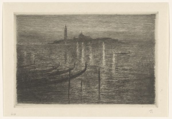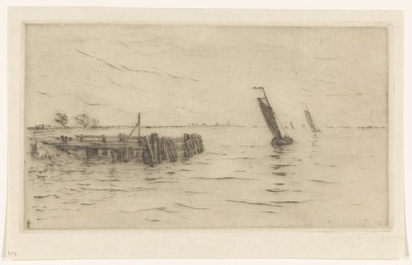 Curator: This is "Seascape with sailboats and setting sun" by Carel Nicolaas Storm van 's-Gravesande, dating roughly from 1851 to 1924. It’s an etching, currently held here at the Rijksmuseum. Editor: My first impression is one of quiet melancholy. The monochrome palette really sets a contemplative tone. The horizon line and the soft light also invite you into this rather minimalist seascape. Curator: Van 's-Gravesande was very active in artistic circles and societies and, as such, very aware of artistic movements, in this case the impact of the Hague School. It seems as though this piece and its muted color palette represents, on the one hand, an accessible work that could garner support from exhibition attendees while simultaneously making a clear political statement advocating for less traditionally glamorous landscapes as worthy subjects for high art. Editor: I'm immediately drawn to the composition. The silhouettes of the boats against the setting sun – there is a vulnerability. It's not simply about boats; it's about the journey, endings, perhaps even loss. Do you think the lack of vivid detail reinforces this? Curator: Absolutely, there is a romantic undercurrent, influenced, of course, by larger forces: rising industrialism threatening the tradition of life at sea. The sun may indeed symbolize decline. These boats are small under an expansive sky. There is a sentimentality that’s at once mournful and beautiful in this decline. Editor: Note how he uses line to depict light, particularly on the water, so it really embodies transition, not just from day to night but possibly from one way of life to another as well. Do you feel this adds a more human layer to it all? Curator: Yes. His engagement in representing these commonplace scenes was definitely an attempt to both monumentalize daily life as well as show his commitment to capturing Dutch scenes with greater detail. It places this moment within a larger conversation about the definition of art. Editor: Seeing it through that lens really shifts the experience. From a tranquil, sunset scene to something imbued with cultural anxieties and statements. Curator: I agree! I think considering van 's-Gravesande within the larger landscape of his time—socioeconomically, politically, artistically—really shapes our modern experience with what he's creating in pieces like this. Editor: Absolutely. Considering the symbols and imagery present in the artwork definitely invites a dialogue of larger significance, something easily missed upon a first glance of something like this.
