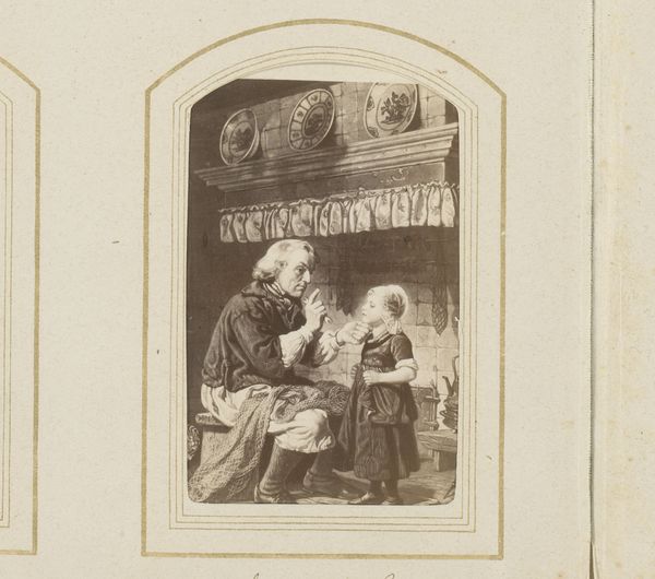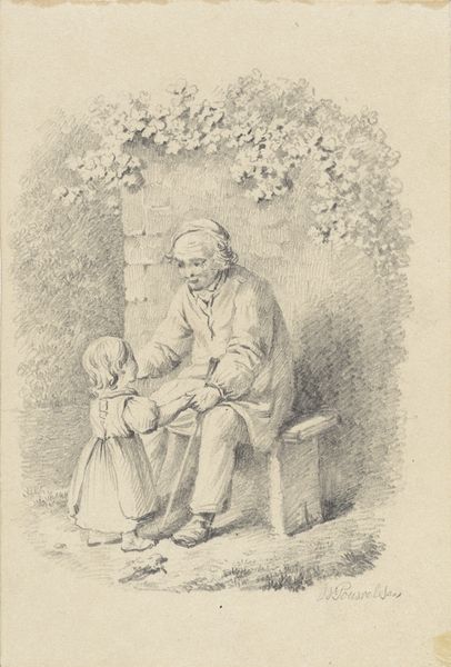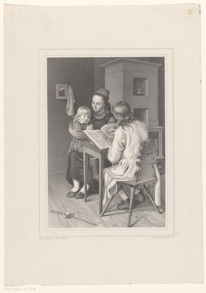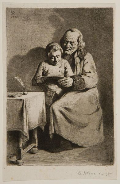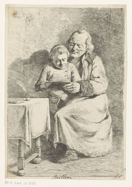 Editor: Here we have "Schoolmeester en jongen een boek lezend" - that translates to "Schoolmaster and boy reading a book" - by Jean Jacques de Boissieu, created around 1770. It's an etching, and it feels very intimate. What's most striking is the intergenerational connection captured here. What do you see in this piece? Curator: It's fascinating to consider this image within the social context of 18th-century education. This etching isn't simply a depiction of literacy; it speaks to the evolving role of education in society and its accessibility, or lack thereof, across social classes. Is this meant for public view? Was it supposed to illustrate that everyone could reach that level of knowledge at the time? Editor: That's a great question. I hadn't thought about it in terms of social status, more about learning in general. So how did the art world and the politics of the time react to an image like this, and were they even aware of its creation? Curator: These images served multiple functions. It provided a template for how knowledge had to be disseminated at the time and in that geographical area. You can imagine these scenes shaping public opinion. It may influence views on who deserves access to education. Does the book here present a particular political or ethical point of view? Was it only available in rich families or to religious people? This book, in itself, as well as the picture that contains it, might be an example of that power struggle, or at least raise awareness. Editor: Wow, I had just viewed it as a sweet scene of learning, but now I see the potential for the image to be a statement, maybe even a political one, about literacy and access. It certainly gives you a lot to reflect on. Curator: Precisely. Art provides us with documents, if you will, about historical views on critical subjects. And by analyzing them, we discover much more about ourselves.
