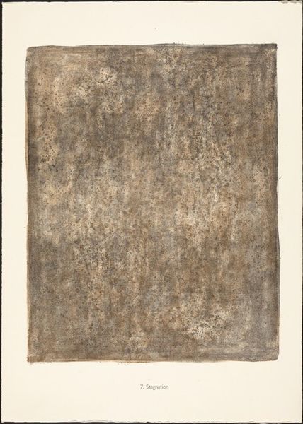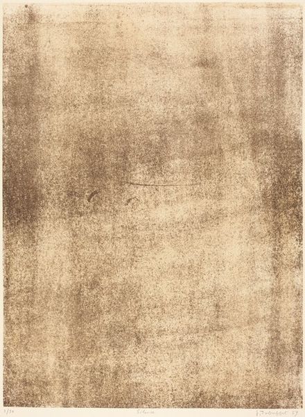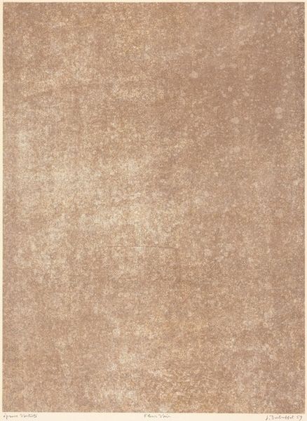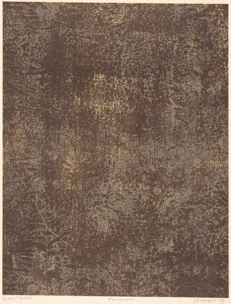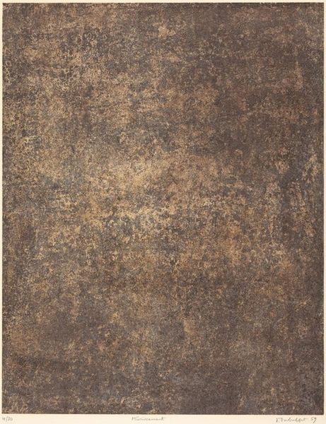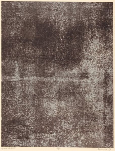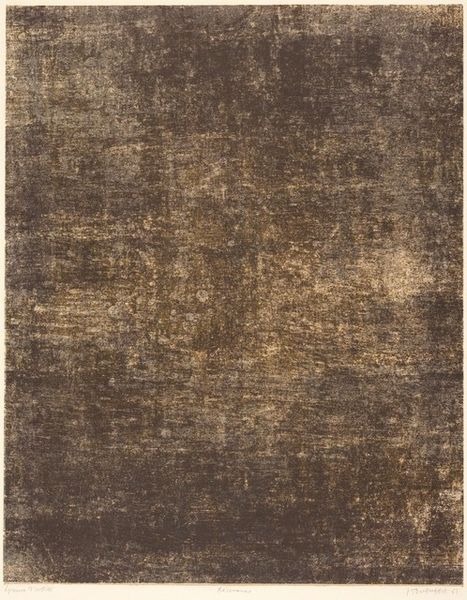 Jean Dubuffet made this work, "Champ de pensée," using lithography, a printmaking technique that embraces the beauty of the imperfect. The piece has a mottled, almost worn texture with various shades of brown and grey blending together. It feels less like a pristine image and more like a fragment of something ancient and weathered. Dubuffet made use of the inherent qualities of lithography, which involves drawing on a stone or metal plate and using oil-based inks. This printmaking process can be quite physical, and its textures are very much on display here. Dubuffet was fascinated by the art of the everyday, the raw and the unschooled. He deliberately challenged conventional notions of beauty and skill, seeking a kind of primal expression. He engaged with the labor of creating prints. Understanding Dubuffet's focus on materials, processes, and social context is essential to fully grasping his work, breaking down traditional barriers between fine art and craft.