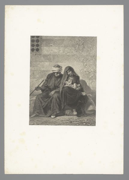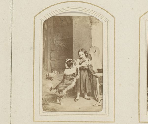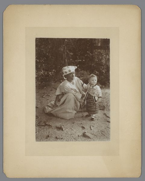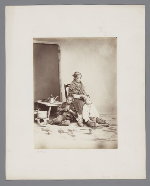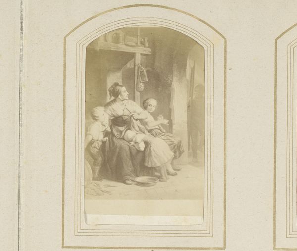 This is an anonymous photograph of a painting by Albert Neuhuys. It captures a woman seated, possibly mending clothes, flanked by two young children. Neuhuys belonged to the Hague School, a group of Dutch realist painters who sought to depict everyday life. Set against the backdrop of agrarian life, we can consider how this scene reinforces notions of domesticity and the roles assigned to women and children within the family unit. The muted tones and soft focus evoke a sense of intimacy. Is this an idealized representation of rural life, or does it offer a glimpse into the realities of labor and care within a working-class family? The image invites us to consider our own assumptions about gender, class, and the romanticization of the past. As an anonymous photograph of an image, it's particularly interesting to consider what it means to document something that is itself a kind of documentation.