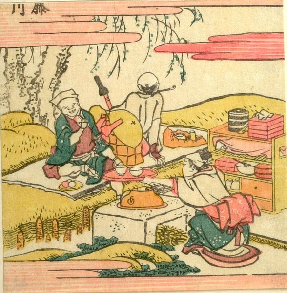 Curator: Here we have Katsushika Hokusai’s charming print, “Two Men and a Woman Making Candies/ Saka no Shita, from the series Exhaustive Illustrations of the Fifty-Three Stations of the Tōkaidō.” Editor: It’s so intimate, isn’t it? The simple composition, combined with the muted colors, makes the candy-making process feel almost tactile. Curator: Absolutely. Hokusai, in this small piece, shows us the commercial bustle supporting the Tōkaidō road, a vital artery of travel and trade. It’s a snapshot of everyday life. Editor: And the labor! Look at the man stirring the huge vat – his bare back, the intensity. This wasn't a leisurely pastime, but demanding work feeding into the larger economic system. Curator: Precisely. Hokusai uses these images of laborers to emphasize the relationship between labor, the road, and culture that emerged from it. Editor: Seeing their effort makes you reconsider something as simple as candy; recognizing the connection to its complex production is key. Curator: Indeed, it pulls the viewer closer to the realities of life along the Tōkaidō.