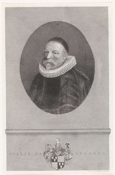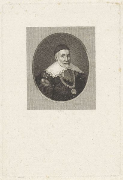 Reinier Vinkeles created this portrait of Hugo de Groot using etching techniques. Vinkeles made this print in a period where the Dutch Republic was undergoing significant cultural and political shifts, influenced by Enlightenment ideals and growing national consciousness. The portrait captures Hugo de Groot, a towering figure in Dutch history known for his contributions to international law and political philosophy. The print reflects the values and intellectual climate of the time, and the values and social hierarchies embedded in Dutch society. The choice to depict de Groot through the precise and detailed medium of etching speaks to a desire to immortalize and elevate this historical figure. In doing so, Vinkeles engages with questions of legacy, justice, and the role of individuals in shaping societal norms. This portrait invites us to reflect on the narratives we construct around historical figures and how these narratives shape our understanding of the past.