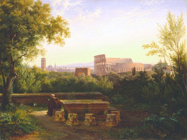 Editor: Here we have "A view of the garden of Villa d’Este in Tivoli, near Rome," an oil painting possibly by Oswald Achenbach. The textures in this garden scene feel incredibly detailed, capturing the light so vividly. What do you see in this piece from a materialist point of view? Curator: This painting is less about pure representation and more about the societal conditions surrounding leisure and artistry. Oil paint, readily available to artists of the time, allowed for the illusion of depth and texture you mentioned. The garden itself, meticulously designed and maintained, speaks volumes about power structures and access to resources. Who benefits from these idealized spaces, and who provides the labor to create them? Consider also the commodification of these scenes – landscapes like this became desirable items for the bourgeoisie. Editor: So, you're saying it's not just a pretty garden, but also reflects a whole system of production? How did the *act* of painting contribute to this system? Curator: Precisely. The artist, as a skilled laborer, is part of that system. His choice of perspective, his rendering of light – these are not just aesthetic decisions, but reflect an engagement with the expectations of his patrons and the market. He is crafting an appealing commodity. Was this painting commissioned or painted speculatively? How might that influence its production? Editor: That makes me think differently about landscape paintings in general. It’s fascinating to think about who funded this "view," and how the work and the materials were part of a larger commercial exchange. Curator: Indeed. By considering the materials, labor, and social context, we gain a more comprehensive understanding of the painting and its place in the world. Thinking about these factors changes our perception and shifts the conversation from purely aesthetic pleasure. Editor: Absolutely. Looking at this work with an eye to labor, resources, and historical systems brings the scene to life on a whole new level. Thanks for the illuminating perspective!