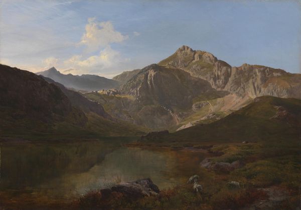 Editor: So, this is John Glover's "Thirlmere," painted sometime in the early 19th century. The way he captures light makes it feel like a lost Eden. What do you see in this piece, beyond the landscape? Curator: I see a potent commentary on land use and ownership. Glover, though celebrated for his landscapes, was deeply implicated in colonial dynamics in Tasmania. Does this idyllic scene obscure the realities of dispossession and environmental change occurring during this period? Editor: That’s a fascinating angle. So, you’re suggesting we can't separate this seemingly peaceful image from the larger historical context of colonialism? Curator: Precisely. The very act of representing this landscape as untouched naturalizes a particular power structure. What isn’t shown is often as important as what is. Editor: This makes me rethink what I initially saw. It’s much more complex than just a pretty picture. Curator: Exactly! Art often asks us to confront uncomfortable truths.
