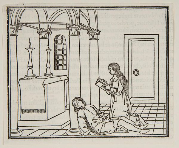 Curator: This is an intriguing woodcut, "Polia drags her prostrate lover by his feet out of the sanctuary," made by an anonymous artist. The stark black lines create a scene of dramatic expulsion. Editor: It's strangely captivating. The rigid lines and the high contrast evoke a sense of harshness, almost cruelty. The perspective is also very compelling. Curator: The print's starkness arises from its likely origin as a book illustration. The labor involved in carving the block itself, the repetitive action…it speaks to the craft of storytelling in a pre-industrial age. Editor: Yes, but look at how the artist used the linear structure of the architecture to draw our eye to the figures, creating depth and a clear narrative. Curator: The architecture tells us about the values of the culture that produced this image and the act of dragging her lover away is equally revealing. Editor: It's a fascinating interplay between form and function. Curator: Indeed. It makes one consider the purpose of such images within the broader cultural context. Editor: Absolutely. The balance within that tension is what gives the piece its power.
