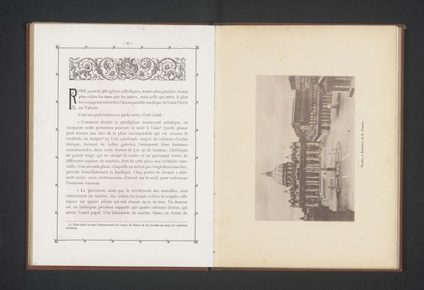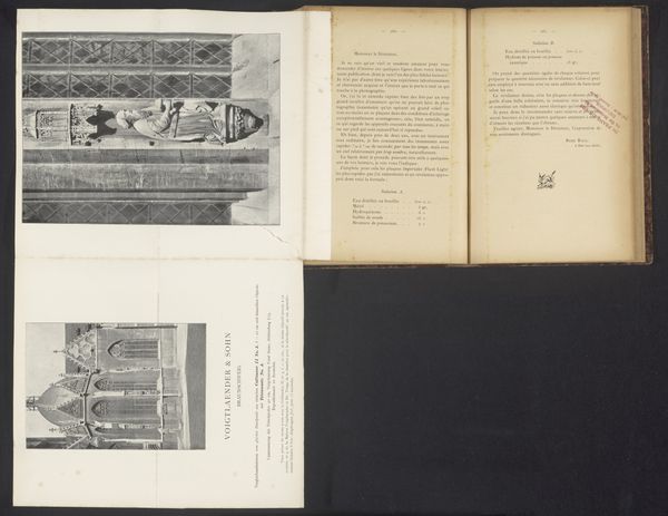 Curator: This reproduction shows "Gezicht op het Piazza della Signoria in Florence," made before 1898, using etching, drawing, print, and photography techniques. Editor: It's an interesting juxtaposition, almost a before-and-after of Florentine art and architecture presented as a flat image in a book. There are elements of photography, etching, and drawing, all in a muted palette. How would you describe the use of line and form here? Curator: Observe the geometry. The hard, ruled lines defining the Palazzo Vecchio contrast with the softer rendering of the statues and decorations depicted on the opposite page. The structure and repetition of architectural forms create a powerful sense of depth. It displays, quite academically, contrasts in styles using this two-page format, wouldn’t you say? Editor: Absolutely. It highlights the textures of each page's image and brings different dimensions together using print. And how does the orientation change— with the Palazzo Vecchio's rotated— impact the reading of the print as a whole? Curator: It disrupts the expected perspective and compels a second look. This displacement emphasizes the inherent flatness of the medium. Rather than striving for illusionistic depth, the artist seems intent on showcasing the act of representation itself. Are the relationships apparent, would you say? Editor: Yes, especially that tension between representation and abstraction, like the difference between seeing and interpreting something. This kind of breaks down any sense of "reality" presented in this print. It also points to a transition in how the architectural form gets displayed within the fine arts in print media. Thanks for pointing those out! Curator: A close inspection always reveals unforeseen aspects; keep your eye sharp!