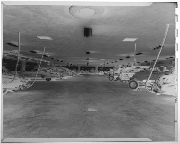 Curator: This gelatin silver print by Harris & Ewing, titled "Untitled (car show, foreign, domestic, travel trailers)," presents such a fascinating scene! Editor: It's striking. The inverted tones give it an almost dreamlike quality, a ghost of mid-century consumerism. Curator: Exactly! The bunting and chandeliers suggest a celebration, but the cars – foreign, domestic, and even travel trailers – hint at deeper currents of postwar identity and aspiration. Editor: I find myself thinking about the gendered element, too. Car culture has historically been so tied to masculine identity. The bodies surrounding them almost appear as accessories, which is telling. Curator: Yes, the figures are present but somehow anonymous, furthering the emphasis on the machines. It's a world caught between progress and a more complicated reality. Editor: It makes you question what the image is really celebrating – the cars or the cultural narrative they represent? Powerful stuff, this reversed mirror.