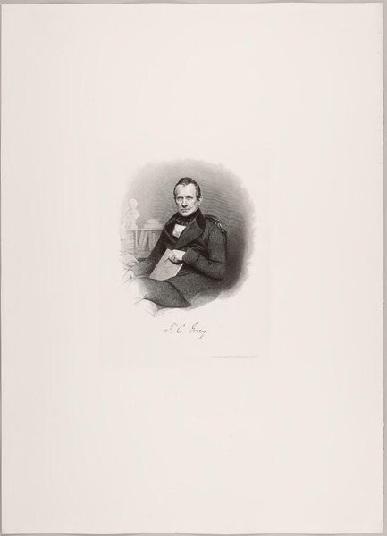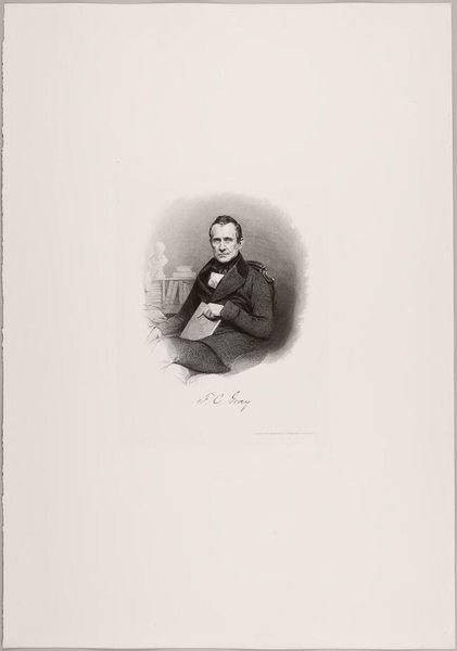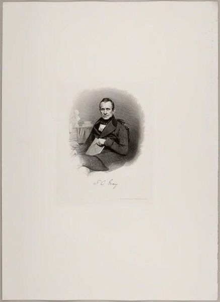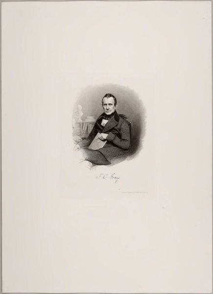 Editor: This is a portrait of Francis Calley Gray by Lazarus Gottlieb Sichling. The cross-hatching gives it an almost photographic feel. What's striking is how the portrait subtly positions Gray in a world of intellect and art. What do you make of it? Curator: It's fascinating how Sichling uses the visual language of portraiture to construct Gray's public image. The presence of the classical bust and the suggestion of books subtly reinforce Gray's status as a man of learning and a patron of the arts. How does this portrayal connect to the broader cultural context of 19th-century Boston? Editor: It's interesting how the objects around Gray seem to validate his status, and imply he belongs to a certain elite. Curator: Precisely. It reflects the 19th-century elite's desire to associate themselves with classical ideals and intellectual pursuits, reinforcing their social standing through visual cues. I hadn't considered that before. Thanks! Editor: Me neither!