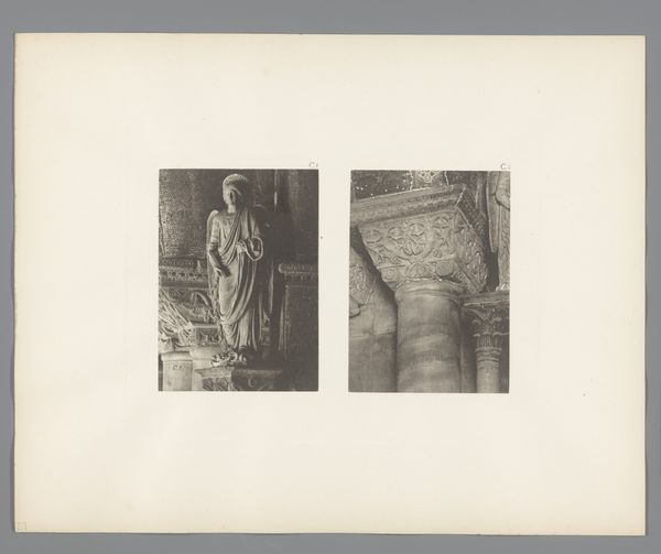 Editor: So, this gelatin silver print, "Relief of a Saint and a Corinthian Capital of San Marco in Venice" by Carl Heinrich Jacobi, predates 1885. The composition is quite stark, presenting two distinct architectural elements. What strikes me is how photography, as a new means of reproduction, captured and disseminated these historical artifacts. What do you make of it? Curator: What I find compelling is how Jacobi's work highlights the evolving relationship between artistic creation and industrial processes. Before 1885, photography was increasingly democratizing access to art and architecture, breaking down geographical barriers to viewing relics. Think about the labor involved in creating the original reliefs and the Corinthian capital versus the relatively less intensive process of photographic reproduction. Editor: That's fascinating. So, you are focusing on how photography as a production method changes how art is consumed. Does the printing medium itself--the gelatin silver print—play a role here? Curator: Absolutely. The choice of a gelatin silver print—a relatively inexpensive and reproducible medium—suggests a move away from unique, handcrafted artistic objects towards mass production. Consider the social context. Who was this photograph intended for? Was it for educational purposes, documentation, or simply to satisfy a growing market for visual representations of European landmarks? These photographs become commodities. Editor: So, it's less about the artistic intention and more about the production, circulation, and consumption of this photographic print? Curator: Precisely. The image is interesting, of course. But focusing on the materiality and context illuminates a broader shift in art production and consumption in the late 19th century. What does it mean when religious iconography becomes so easily reproducible? Editor: This has really changed how I'm thinking about photography! Instead of focusing solely on subject, consider production processes as another interpretive angle. Thanks for shedding some light on this. Curator: My pleasure, thinking materially can yield so many exciting revelations!